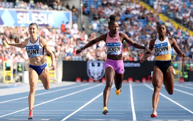 A big showdown in the men’s 100m which featured many of the probable contenders at next month’s World Championships saw Kishane Thompson of Jamaica win in 9.87 (0.3).