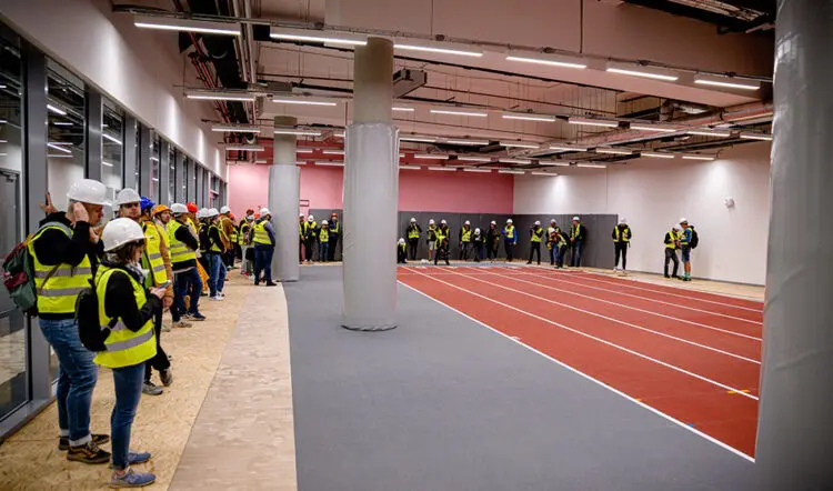 Although the roof structure has long been part of the panorama of the Danube, the Hungarian media were shown the freshly laid Mondo surface and completed grandstands.
