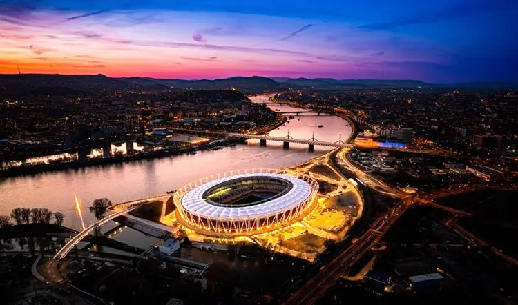 There is also an indoor six-lane running track and in parallel with the construction of the stadium a 168m-long single-pylon pedestrian bridge – also known as the Robinson Bridge – has been completed to link the arena to the training ground on Csepel Island.