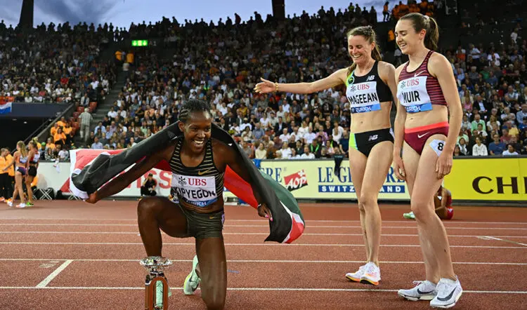 With a searing finish, the Kenyan flew to a time of 3:51.29, with Australian Jessica Hull winning silver in 3:52.56 and Georgia Hunter Bell breaking Laura Muir’s British record to take bronze in 3:52.61.