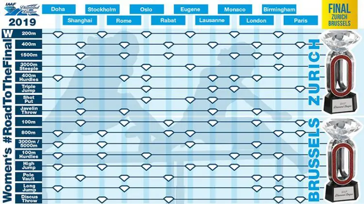 The IAAF has announced the distribution of Diamond League disciplines for the 2019 season, confirming where and when athletes will contest each event in the 14-meet series.