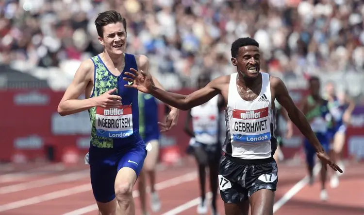Another Norwegian to shine at this London leg of the Diamond League series was Jakob Ingebrigtsen. Still only 18, he clocked a European under-20 and Norwegian senior record of 13:02.03 just behind Hagos Gebrhiwet (13:01.86) (pictured below) who had won the Ethiopian world 10,000m trial in 26:48.95 in Hengelo just three days earlier.